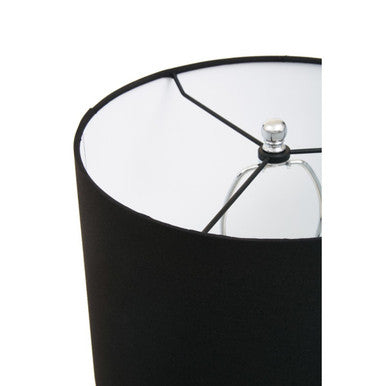 The black base grounds the design with contrast, while the fabric shade tempers the glow for a comfortable, ambient effect. Its neutral palette ensures versatility across a variety of interiors.