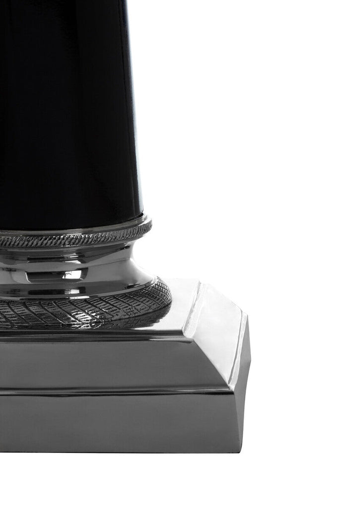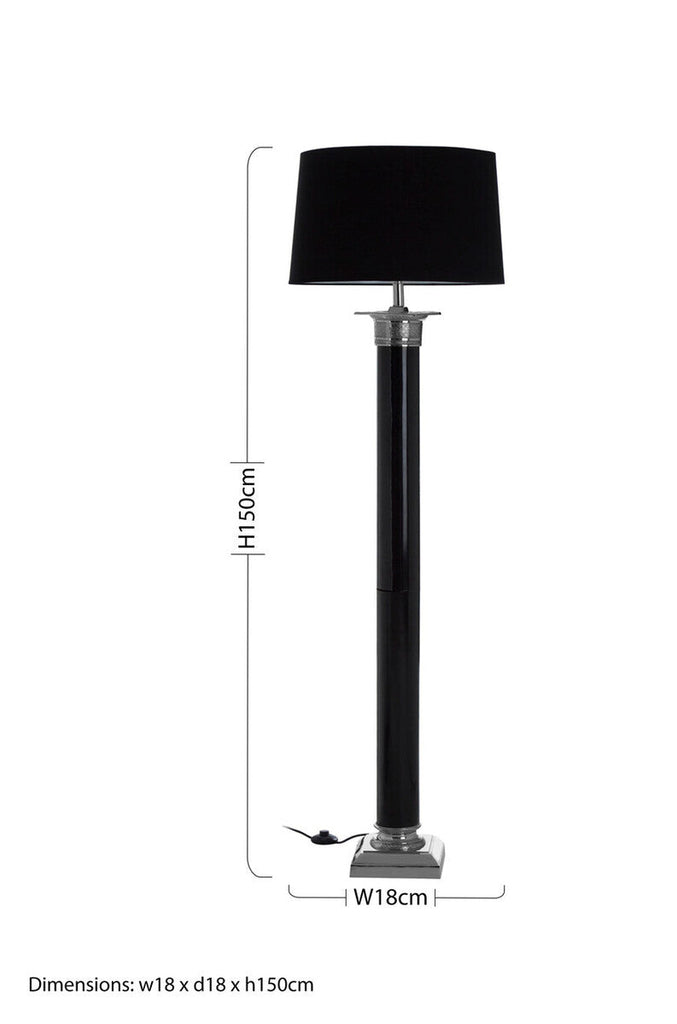 The Camron Floor Lamp is a black floor lamp with classic proportions and refined detailing. A tiered base with a reflective nickel finish anchors the piece, echoing the polished accents at the top and bottom of the column.