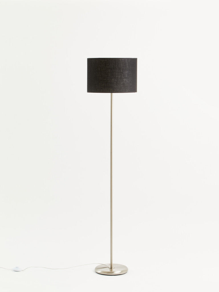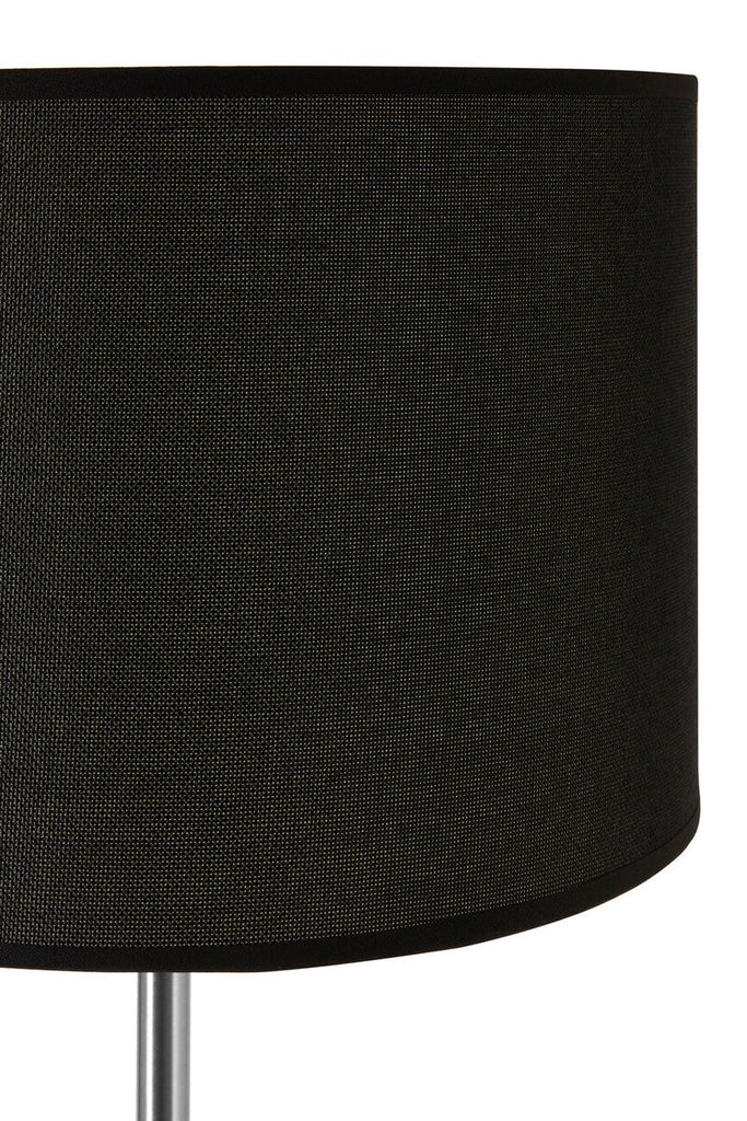 Sleek and stylish, this stainless steel floor lamp features a polished chrome stand and a wide rounded base. The black waffle effect drum shade adds texture and contrast to the cylindrical body, creating a chic monochrome look.