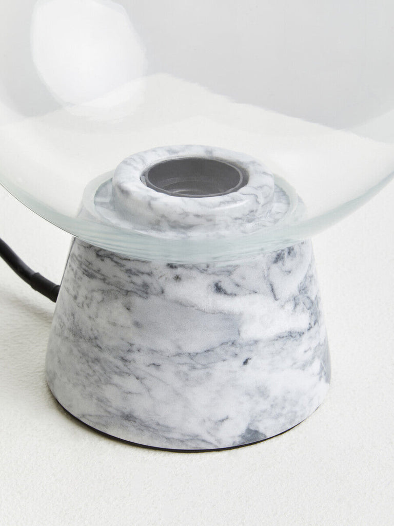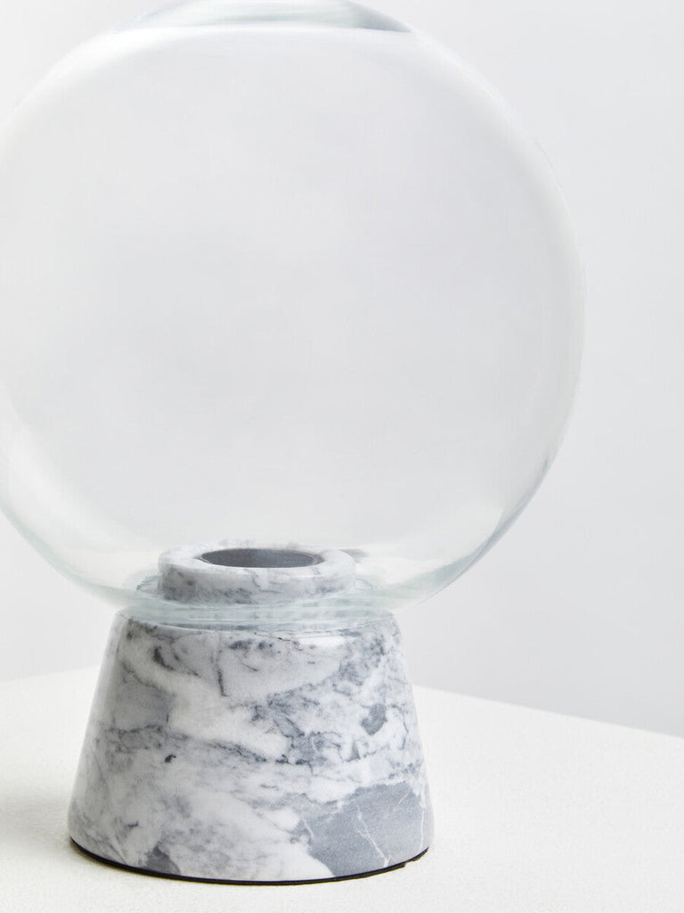 The lamp's marble base is completely solid, and provides ample support for the ethereal glass globe that sits safely on top of it, providing a contrast to the heavy, solid nature of the base. The clear glass globe looks great paired with a filament bulb.