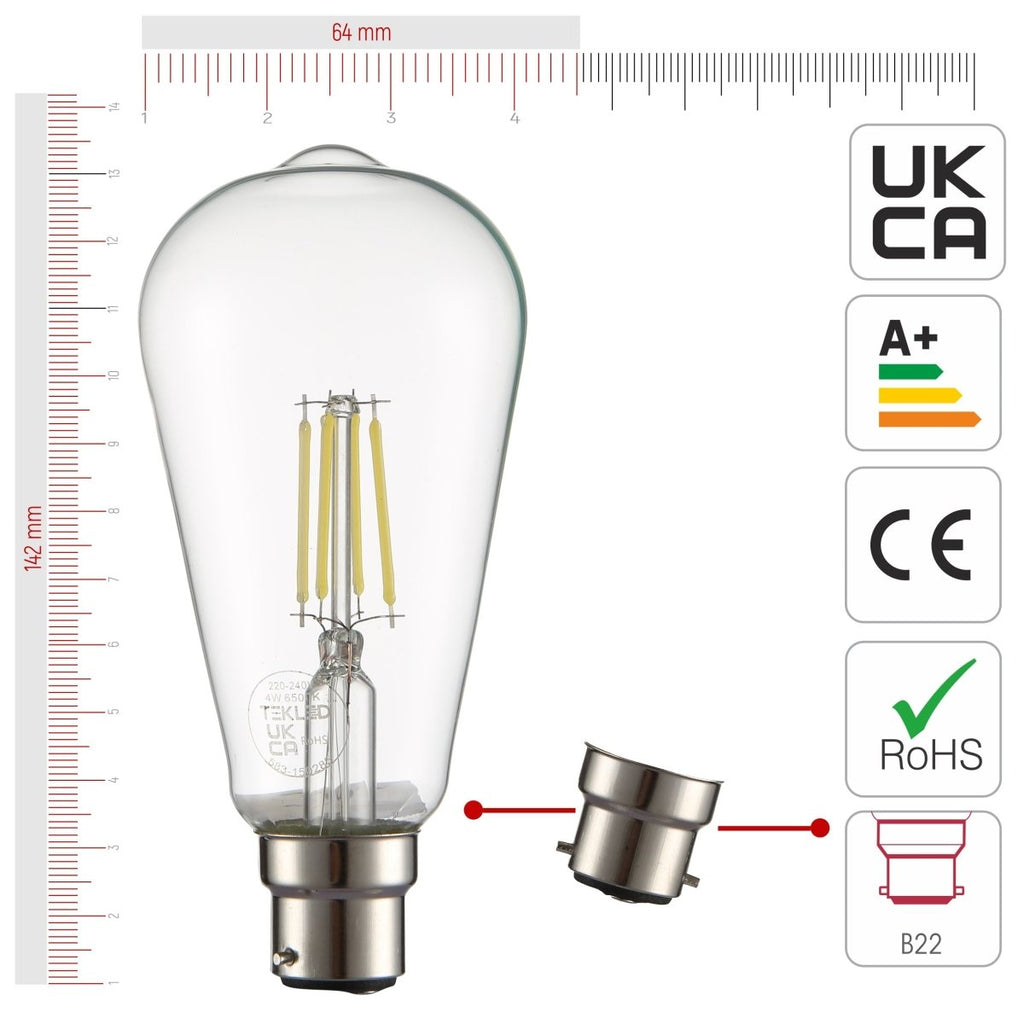 | Name | LED Filament ST64 Edison Bulb B22 Bayonet Cap 4W 6.5W Pack of 4 Cool White Cool Daylight |