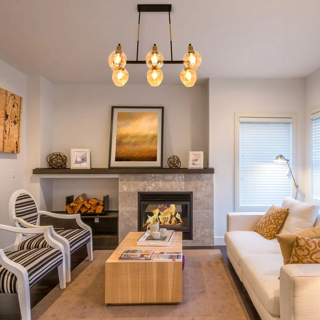 This striking six-light island chandelier makes a statement in any dining room or kitchen. Its linear design features amber cone-shaped glass shades, which beautifully diffuse the light from the bulbs (not included - you’ll need to buy these separately). The black and gold metal body adds a touch of modern elegance.