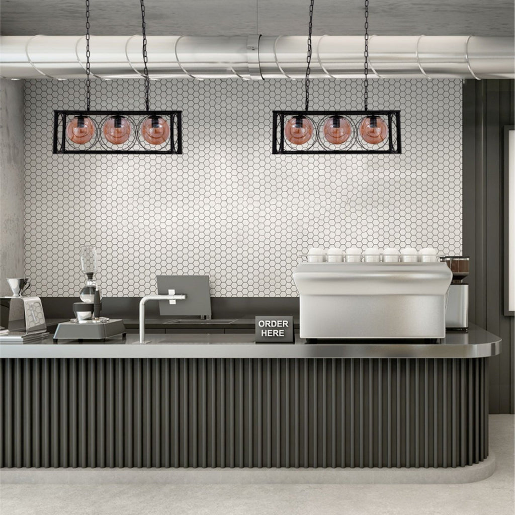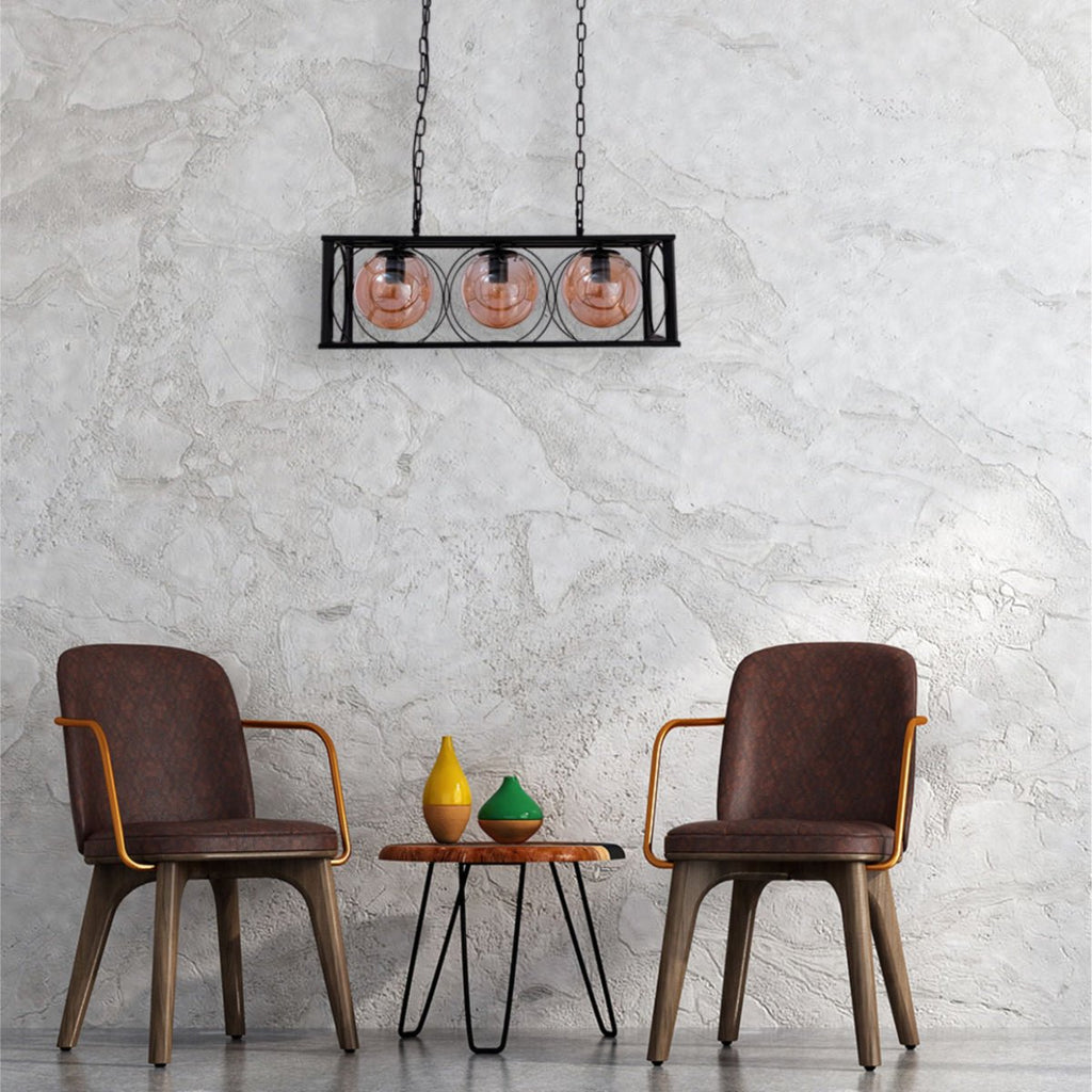 This striking island chandelier ceiling light features a rectangular, black metal frame and three amber-toned glass globe shades. The warm amber glow creates a cosy and inviting atmosphere, perfect for dining areas and kitchen islands. The adjustable drop length allows for flexible placement.